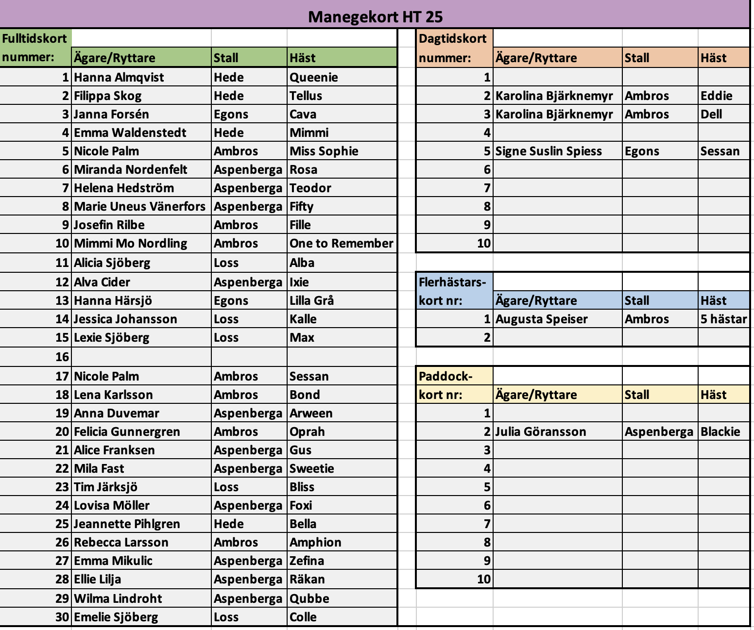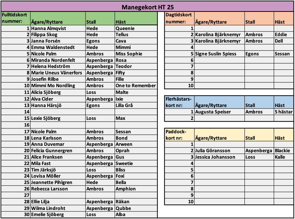 I bilden nedan listas aktuella manegekort höstterminen 2025 (gäller 1 juli - 31 december 2025)